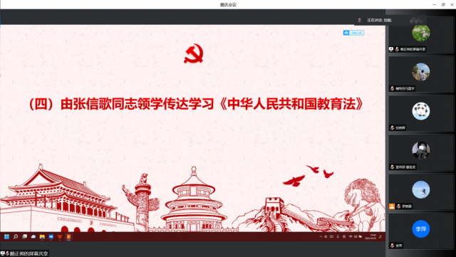会议第四项议程由张信歌传达学习《中华人民共和国教育法》。教育必须为社会主义现代化建设服务、为人民服务,必须与生产劳动和社会实践相结合,培养德智体美劳全面发展的社会主义建设者和接班人。