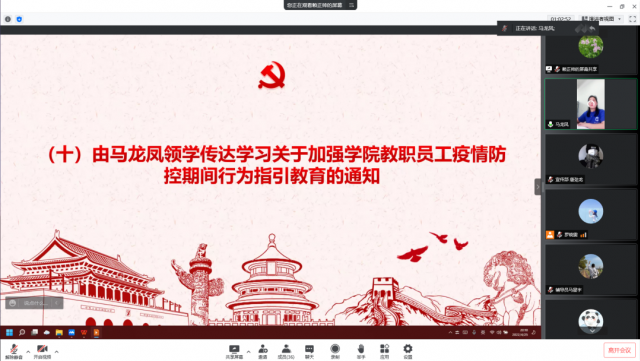 在全市上下抗“疫”期间,我系教职工全力以赴完成学院的每项疫情防控指令,师生们停课不停学,有条不紊开展线上教学的同时,作为党员同志,我们也从未停止学习的步伐,机电工程系于2022年4月25日晚7:30分在腾讯会议召开线上四月份第二次政治学习。会议由光明党支部书记、系主任马龙凤主持,机电工程系全体教职工参与此次会议。
