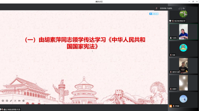 会议第一项议程由胡素萍传达学习《中华人民共和国国家宪法》。宪法以法律的形式确认了中国各族人民奋斗的成果,规定了国家的根本制度和根本任务,是国家的根本法,具有最高的法律效力。全国各族人民、一切国家机关和武装力量、各政党和各社会团体、各企业事业组织,都必须以宪法为根本的活动准则,并且负有维护宪法尊严、保证宪法实施的职责。