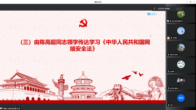 会议第三项议程由陈高超传达学习《中华人民共和国网络安全法》。国家倡导诚实守信、健康文明的网络行为,推动传播社会主义核心价值观,采取措施提高全社会的网络安全意识和水平,形成全社会共同参与促进网络安全的良好环境。