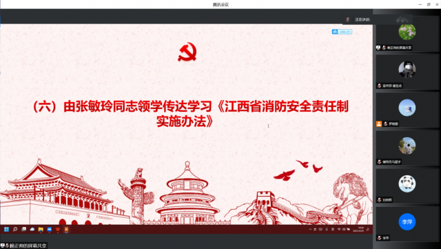 会议第六项议程由张敏玲传达学习《江西省消防安全责任制实施办法》。按照政府统一领导、部门依法监管、单位全面负责、公民积极参与的原则,坚持党政同责、一岗双责、齐抓共管、失职追责,实行消防安全责任制。