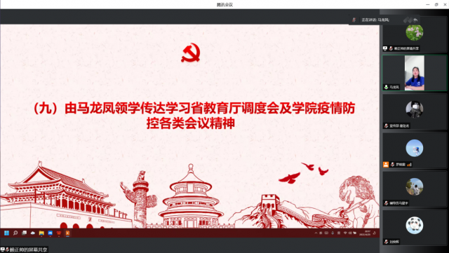 会议第九项议程由马龙凤传达学习省教育厅调度会及学院疫情防控各类会议精神。各相关职能部门要履职尽责、紧密合作,科学精准加强疫情防控措施,有力有效做好疫情防控工作,全力保障全校师生员工健康安全。