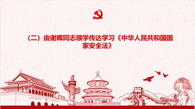会议第二项议程由谢晖传达学习《中华人民共和国国家安全法》。国家安全是指国家政权、主权、统一和领土完整、人民福祉、经济社会可持续发展和国家其他重大利益相对处于没有危险和不受内外威胁的状态,以及保障持续安全状态的能力。