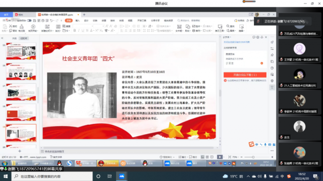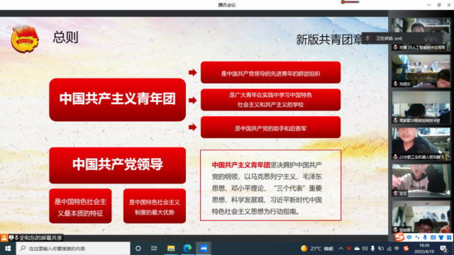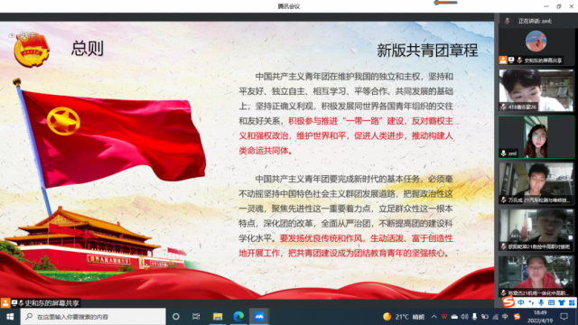 为充分发挥团组织教育青年的作用,进一步加大入团积极分子的教育培养力度,机电工程系以建团百年为题材,以团校学员为主体4月18日晚上6点在线上开展了机电工程系2021-2022下半年业余团校的第一堂团课。本次团课突出了思想政治教育重要性,讲述了中国共青团百年奋斗的光辉历程。让青年从党的辉煌历史中认识到中国共产党的伟大、从中汲取精神力量,坚定理想信念。