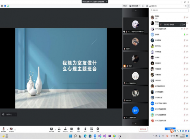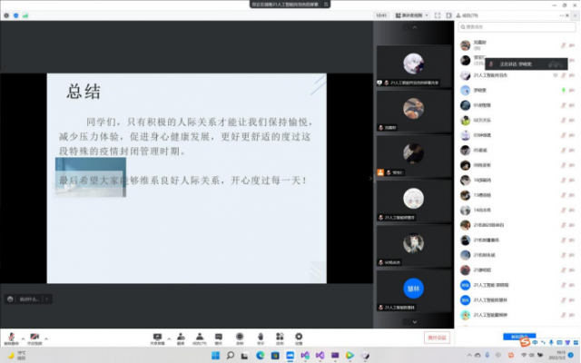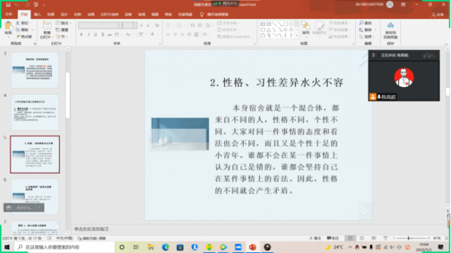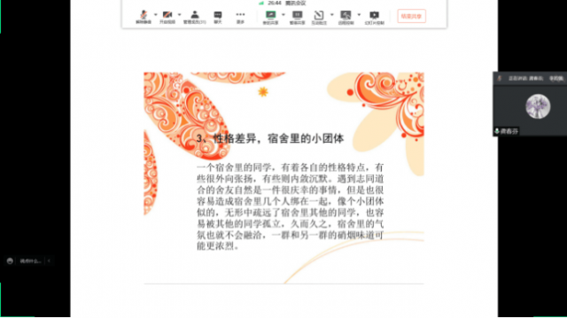 会中老师提到以下几个方面:首先,学会照顾自己、照顾他人。大学舍友来自不同地区,生活习惯、饮食习惯、交流方式等方面存在差异,因此包容与理解这些差异并且试着为舍友着想非常重要。其次,出现矛盾学会沟通。语言是我们表达感情最直接的方式,舍友间有什么矛盾一定要及时当面讲清楚,共同解决。再其次,互帮互助,直面人生。我们应该与舍友默契配合,积极参与宿舍的清洁和管理,在学习上以及生活上互帮互助,团结能将我们拧成一股谁也斩不断的绳!最后,积极参加宿舍活动。定期的集体活动能够增强舍友感情,无论是体育运动还是休闲活动,多聚聚,友谊就不会淡去。