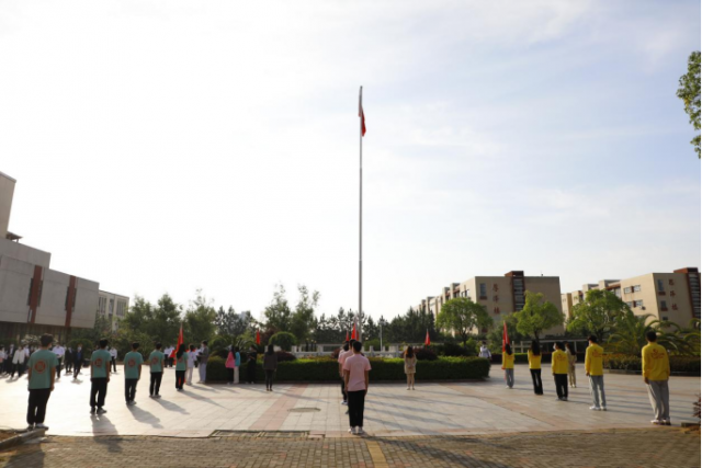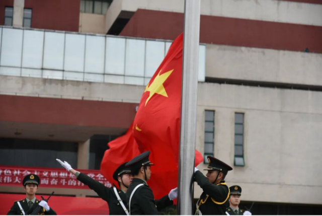 早上七点全体人员集合完毕,进行仪式第一项——升国旗。在全体共青团员的注目礼下,英姿飒爽的国旗护卫队队员们紧握钢枪、步履坚定,护卫着神圣的国旗从队伍中间走过。雄壮的国歌再次响起,全体机电学子肃然起敬、齐唱国歌,向国旗致敬,向祖国母亲送出真诚的祝福。伴随着庄严的《中华人民共和国国歌》,五星红旗冉冉升起,迎风飘扬。