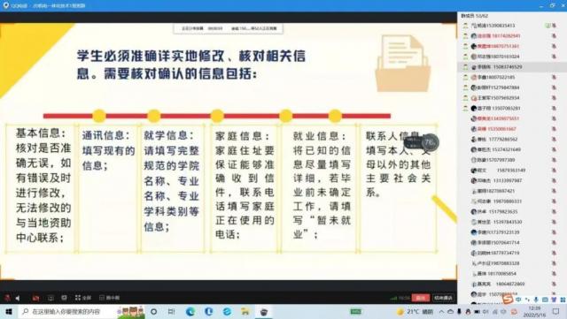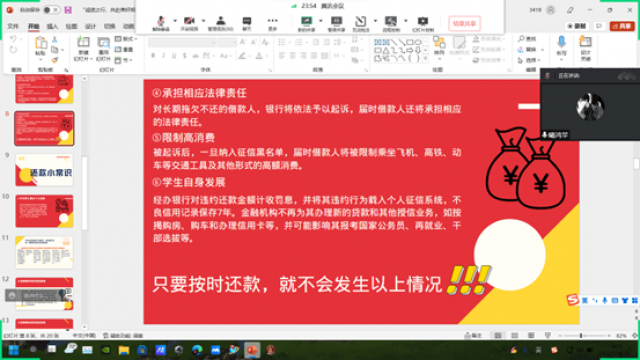 活动中,2022届毕业班辅导员详细讲解了助学贷款知识,包括解读贷款拖期还利息问题、解读一系列的诚信还款的益处以及恶意拖欠贷款的不良影响。并强调国家助学贷款是一种信用贷款,按时还款,如期履约,是每一名贷款学生的义务,是对自身贷款信用和声誉的珍惜与维护,也是对国家和学校的回报。通过详细解析、线上及时答疑等方法,解决相关毕业生们存在的一些问题,提高了相关毕业生对生源地贷款还款的重视。