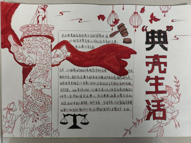 学生们参与热情高涨,通过广泛收集有关民法典的资料,精心设计手抄报版面,以图文并茂的形式在手抄报上展示了自己对于《民法典》的认识与理解。本次活动开展学习宣传《民法典》,帮助学生进一步深入学习宣传《民法典》,深刻把握核心要义和精神实质,不断增强法律意识和法治观念而举办的活动。 通过此次活动 深化了师生们对《中华人民共和国民法典》的认识 增强了学生们的法治意识 帮助学生们树立了用法律思维和法治方式 来思考解决问题的法治理念和法律意识 为构建法治校园营造了良好的氛围 增强民法典宣传的吸引力和感染率