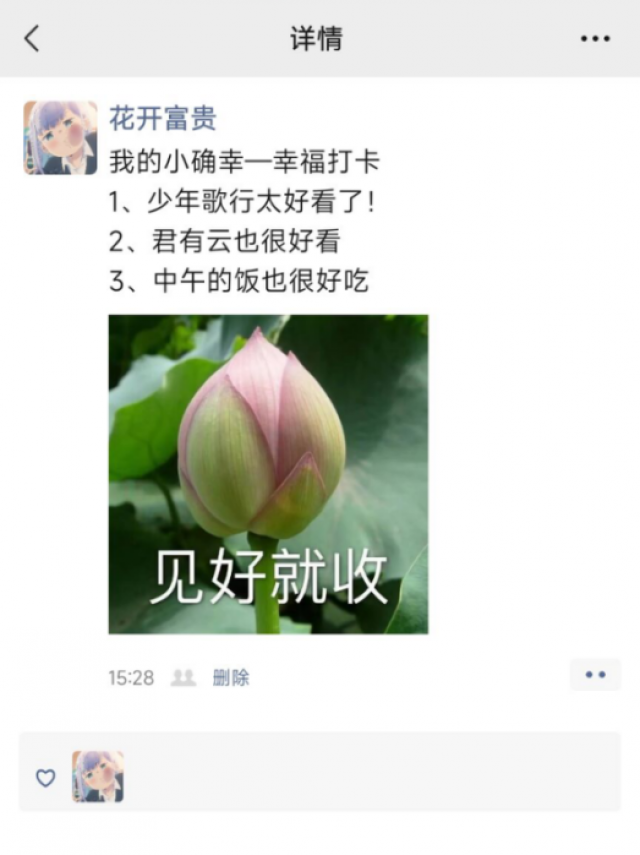 大家在追逐天边的玫瑰园时,也不要忘记“窗前的玫瑰”哦。一蔬一饭,一娉一笑,那些生活中的小确幸,就是我们“窗前的玫瑰,让我们一起收集快乐、放大幸福吧! 或出于好奇,或出于开心,当每个人回想起今日份的幸运或快乐时,笑容总会不自觉地浮现出来。是的,我们的日常就是由无数个小小的奇迹组合而成的,每一分每一秒都充满了奇迹。偶然回想一下,生活就会充满了希望与快乐!