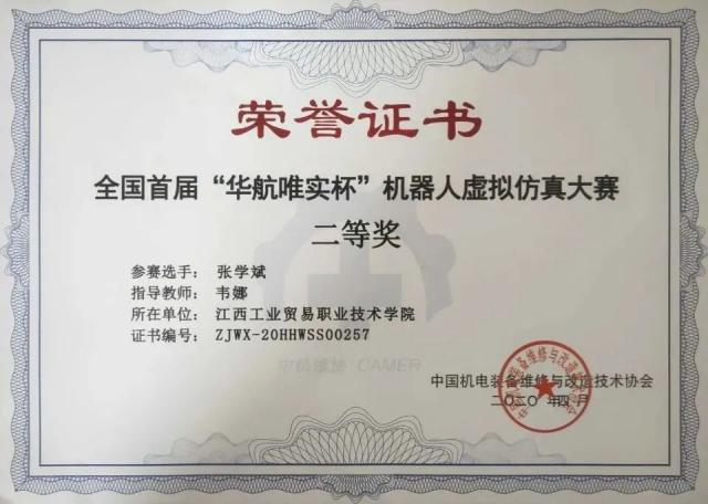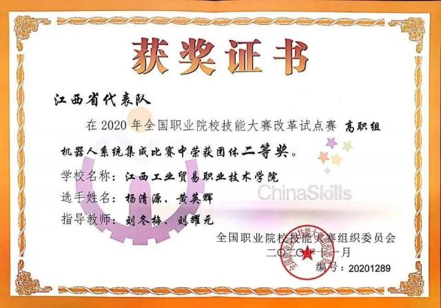 2018级工业机器人技术专业杨清源(左一),参加2020年全国职业院校技能大赛试点赛获全国第6名(全国二等奖)、省一等奖,专升本至南昌航空大学专项“未来工匠培育计划”焊接专业继续深造。 我的技能证书