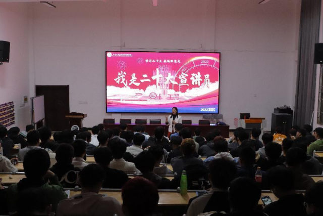 为深入学习领会党的二十大精神,奋力谱写新时代中国特色社会主义育人新篇章,将二十大精神深植学生心中,唤醒每位学生成为二十大精神的广播员、宣讲员。推进新时代文明实践站营造“踔厉奋发、勇毅前行”的奋进氛围,机电工程系党支部开展“我是二十大宣讲员”主题宣讲活动。 2022年11月23日晚上19:00,机电工程系党支部书记马龙凤同志在乐学楼209教室以《党的二十大报告辅导读本》为蓝本,以“学习二十大 永远跟党走”为主题的党课宣讲会。20机电1班、20机电2班、20机械制造与自动化、20新能源、20汽车检测与维修班参加。