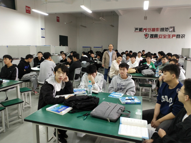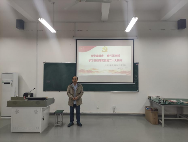 为深入学习领会党的二十大精神,奋力谱写新时代中国特色社会主义育人新篇章,将二十大精神深植学生心中,唤醒每位学生成为二十大精神的广播员、宣讲员。推进新时代文明实践站营造“踔厉奋发、勇毅前行”的奋进氛围,机电工程系党支部开展“我是二十大宣讲员”主题宣讲活动。 2022年11月22日上午9:00,机电工程系党支部党员朱祖武同志在数控实训中心202教室以《党的二十大报告辅导读本》为蓝本,以“爱国爱校 练好技能”为主题的党课宣讲会。机电工程系20电气自动化技术班全体同学参加。