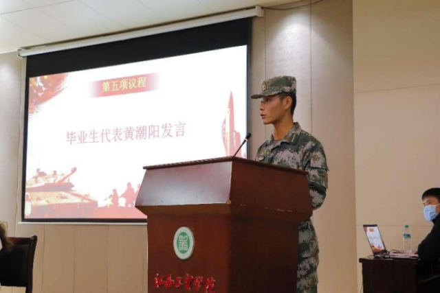 毕业生代表黄潮阳分享了自己的军营梦,以及作为一名即将毕业的大学生对于未来的选择,他说道男儿投身军营,保家卫国,一人从军,全家光荣。也让全场和他一样的毕业生更坚定了对军旅生活的向往。