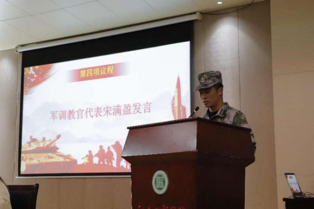 宋满盈代表受表彰的军训教官发言,鼓励所有的教官坚守岗位,秉承教官大队“听从指挥,刻苦训练,团结进取,奉献工贸”的十六字箴言,发扬机电人团结拼搏、吃苦耐劳的精神,在工作岗位上发光发热,在教官大队再创辉煌。