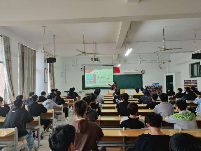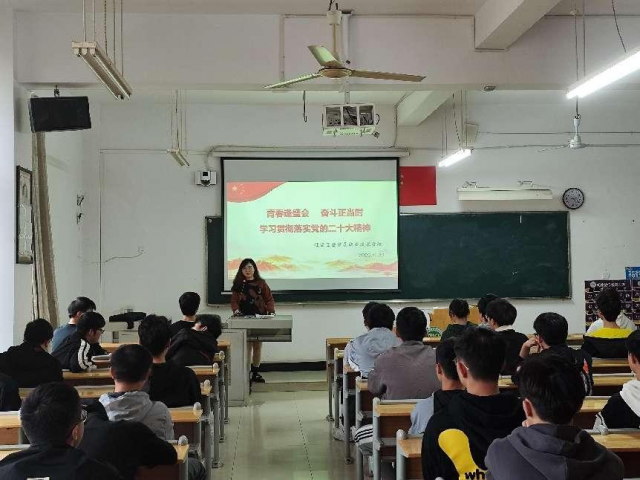 为深入学习领会党的二十大精神,奋力谱写新时代中国特色社会主义育人新篇章,将二十大精神深植学生心中,唤醒每位学生成为二十大精神的广播员、宣讲员。推进新时代文明实践站营造“踔厉奋发、勇毅前行”的奋进氛围,机电工程系党支部开展“我是二十大宣讲员”主题宣讲活动。 2022年11月22日下午16::00,机电工程系党支部张敏玲同志在志学楼207教室以《党的二十大报告辅导读本》为蓝本,以“青春逢盛会 奋斗正当时”为主题的党课宣讲会。机电工程系21机电2班参加。