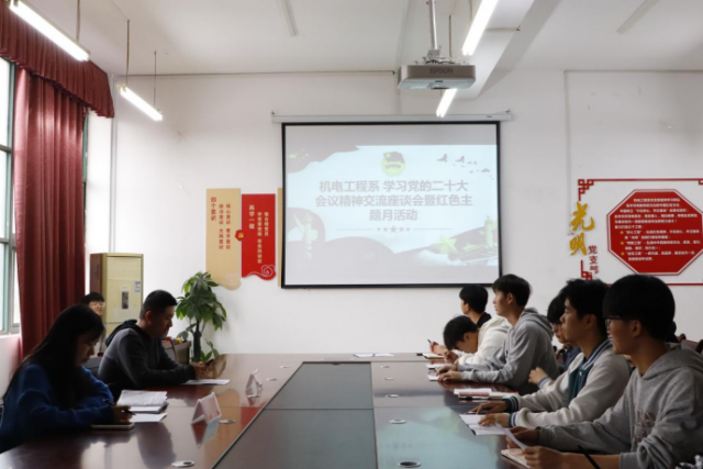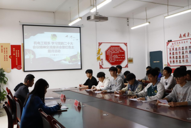 为深入学习贯彻党的二十大会议精神,引导广大青年学子坚定不移听党话、跟党走,做好党的忠实助手和忠诚后备军,努力成长为堪当民族复兴重任的时代新人。 机电工程系于2022年11月22日下午16:00组织系学生会开展认真学习党的二十大会议精神交流座谈会。支部组织委员徐悦欣及学生会各部门代表参加会议,会议由系团总支书记马星宇主持。