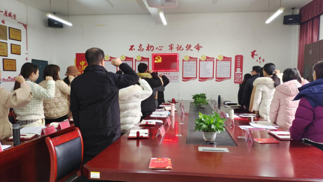 之后全体党员起立,庄严地面对党旗,重温入党誓词,回忆自己的入党过程,时刻牢记入党时的誓言。