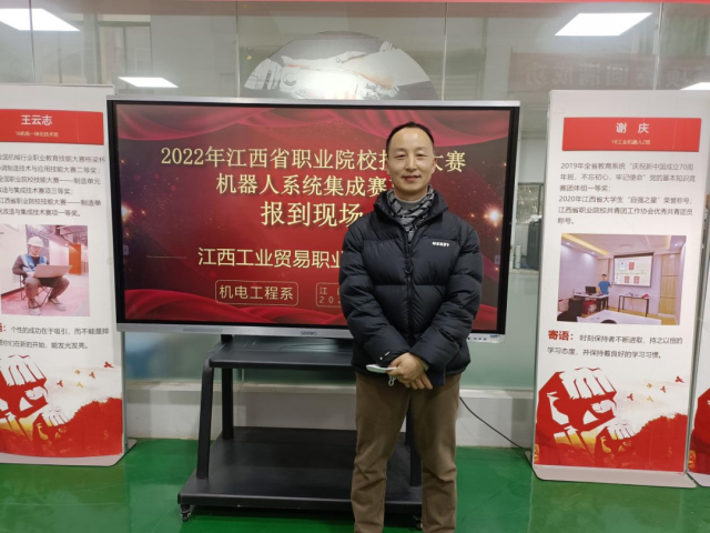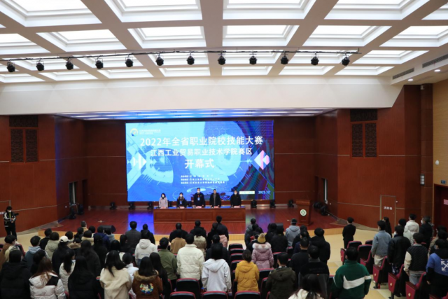 培训会上,马主任传达了2022年江西省职业院校技能大赛机器人系统集成技能赛项工作的要求,按照比赛安排流程,分解工作任务并确定相应的负责老师。涉及的内容包括工作安排、接待引导以及注意事项,每项工作具体落实到人,为比赛的顺利进行提供强有力的保证。 马主任对备赛工作提出三点要求:一是各位负责老师要高度重视,统一思想,提高站位;二是工作目标要明确,参与教师加强协作、凝心聚力,保证竞赛顺利开展;三是后勤保障要到位,严格按照技能竞赛基地建设标准,切实做好筹备工作。 开幕式凝聚共识,匠心筑梦展风采 12月26日下午14:30在图书馆学术报告厅隆重举行2022年全省职业院校技能大赛江西工业贸易职业技术学院赛区开幕式,学院党委副书记、院长万晓波、学院党委委员、副院长胡晖参加此次仪式,全院师生代表参会。