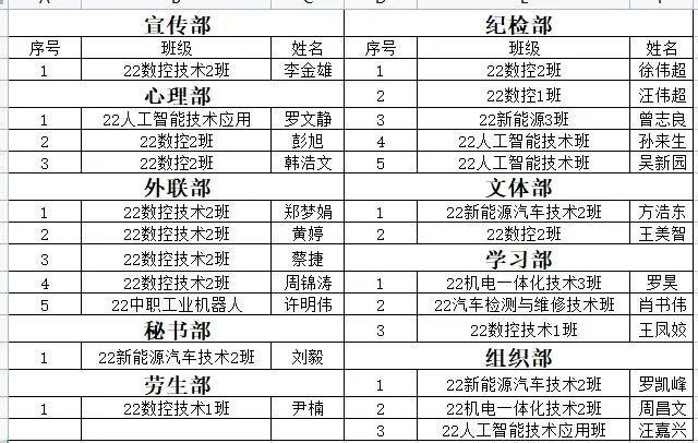 未面试上的同学也不要气馁,你们也同样优秀,机电工程系会将优秀的你们推给学院各部门,大家加油! 因履职不合格等情况,给予以下三名学生干部免职处理(任职期间考核不合格,履职分减半): 21机械及自动化技术班邹宝仁免去外联部部长一职 21机电一体技术1班廖亦威免去秘书部副部长一职 21机电一体技术1班蔡宏涛免去秘书部副部长一职 调整增补如下学生干部为部门负责人,名单如下: