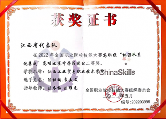 2022年全国职业院校技能大赛“机器人系统集成”赛项团体二等奖证书