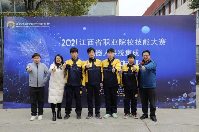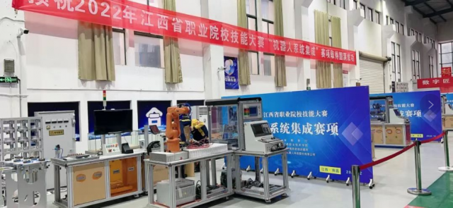 2022年江西省职业院校技能大赛“机器人系统集成”赛项比赛赛场  2021年江西省职业院校技能大赛高职组“机器人系统集成”省赛赛场  2021年江西省职业院校技能大赛“机器人系统集成”赛项选手和指导老师合影  2020年江西省职业院校技能大赛“制造单元智能化改造与集成技术”赛项裁判和承办单位老师合影  工业机器人系统集成竞赛设备