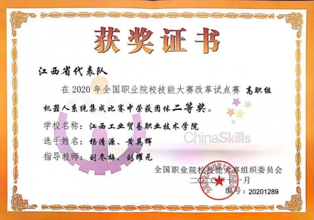 2020年全国职业院校技能大赛改革试点赛“机器人系统集成”赛项团体二等奖证书
