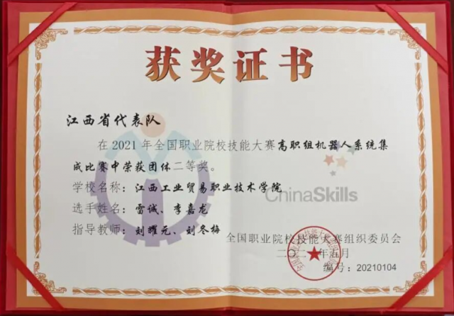 2020年全国职业院校技能大赛改革试点赛“机器人系统集成”赛项获奖选手和指导老师合影  2021年全国职业院校技能大赛“机器人系统集成”赛项团体二等奖证书  2021年全国职业院校技能大赛“机器人系统集成”赛项团体二等奖获奖选手