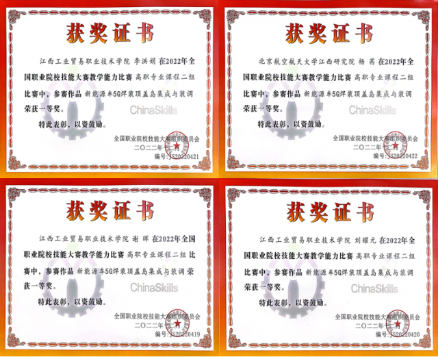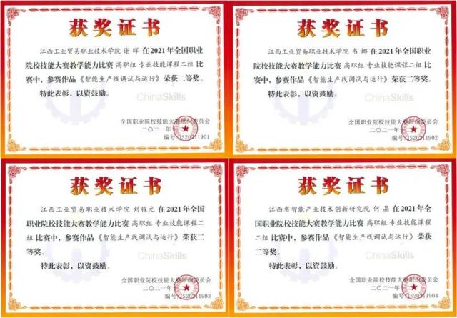 2022年全国职业院校技能大赛“机器人系统集成”赛项获奖选手和指导老师合影  工业机器人教师团队获2022年全国职业院校技能大赛教学能力比赛一等奖  工业机器人专业教师团队获2021年全国职业院校技能大赛教学能力比赛二等奖  2021年全国职业院校技能大赛教学能力比赛二等奖证书