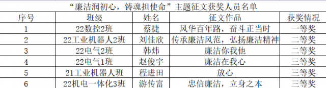 “廉洁润初心,铸魂担使命”主题征文比赛获奖班级人员名单