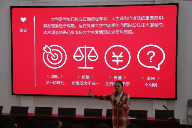 随后,晏慧敏主任给心理干部介绍了恋爱与爱情的含义与实质,让大家对恋爱观有更加深刻的理解,大学生要正确对待恋爱。正确处理好恋爱、学业之间的关系。恋爱是人生的一件大事,但并不是人生的全部。