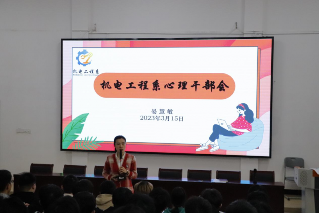 为进一步加强学生心理委员的心理危机识别与干预能力,维护广大学生的身心健康,保障学生的心理健康教育安全,充分发挥学院学生心理工作四级防控体系力量,提高学生重视心理健康意识。 机电工程系于2023年3月15日在乐学楼209召开心理干部培训会议,会议由机电工程系副主任晏慧敏主讲,参加此次会议的有专业系心理部成员、班级心理委员、心理保健员。