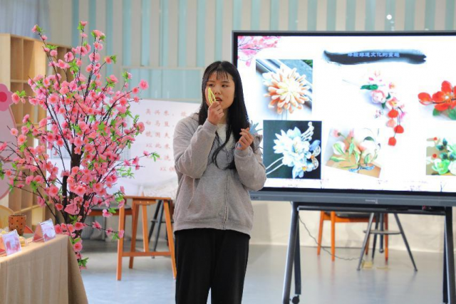 大家一边制作徐悦欣老师一边讲解绒花的起源,绒花是一种历史悠久的传统装饰,最初作为发饰产生,起源于唐代......绒花也会随着时代的变化而发展。