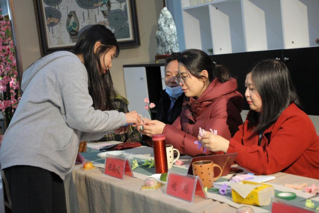 “华夏衣冠锦绣藏”。中国每个朝代的服饰都有其独特的韵味。唐制汉服,明朝的典型服饰、汉元素服饰。文化有大美,自信以持之。现在越来越多的年轻人自信的穿着汉服走上街道,走入校园,每到之处都是一道靓丽的风景。 体验非遗文化的童趣绒花手工制作 在场辅导员通过耳朵听了五粮文化深厚之美,眼睛看了传统服饰精致美,心中也感悟了我们的传统文化之美,接下来辅导员们通过制作绒花感受心灵手巧之美。