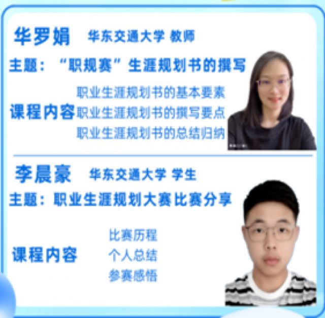 专家就职业生涯规划书的基本要素,职业生涯规划书的撰写要点,职业生涯规划书的总结归纳等方面进行指导。还有优秀标杆李晨豪通过分享他的比赛历程,个人总结,参赛感悟。激励同学们在职业生涯中不要迷茫。