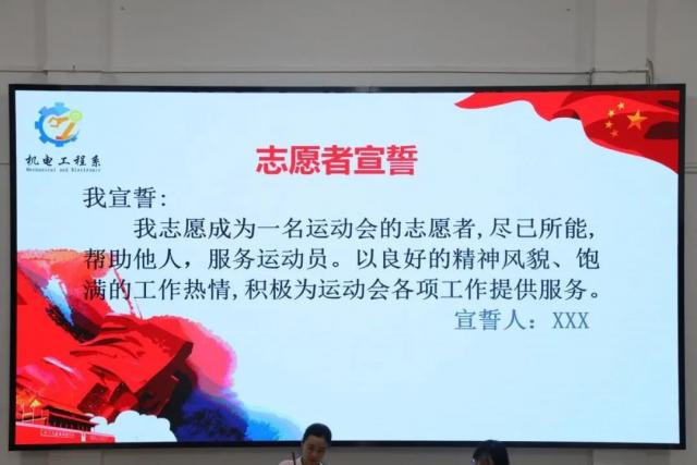 由志愿者代表方浩东进行宣誓,在此次运动会上,志愿者们的身影会经常在人群中穿梭,他们身上有着维持运动场秩序安全,展现机电学子风采的重要责任。 风华正茂逐梦扬威