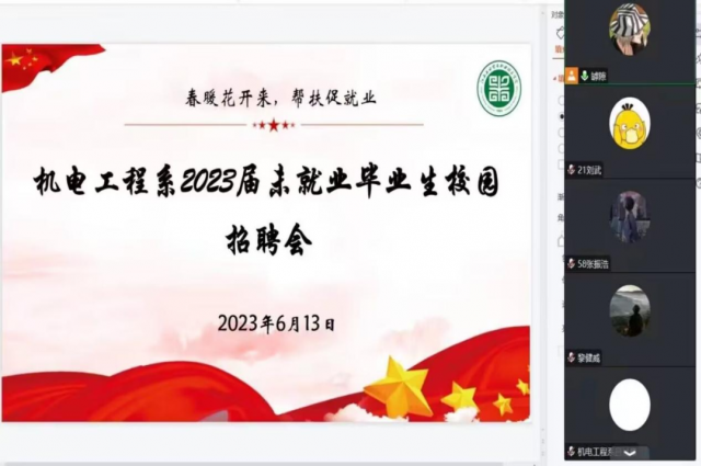 为深入学习贯彻党的二十大精神,落实党中央、国务院和省委、省政府“稳就业”“保就业”决策部署,充分发挥国有企业稳岗促就业示范带动作用,抢抓促就业工作关键期,全力促进我院2023届毕业生顺利就业,机电工程系于6月13日(周二)下午2点通过线上平台腾讯会议举办 “春风展翅 职等你来”高校毕业生线上专场招聘会,为未就业毕业生提供更多就业机会。
