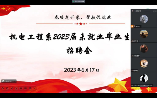 为贯彻落实党中央、国务院“稳就业”“保就业”决策部署,按照政府工作报告“做好高校毕业生等重点群体就业工作”的部署要求,大力拓宽市场化就业渠道,强化毕业生就业服务,打造学校、学生与用人单位的交流平台,提供不断线的就业服务,2023年6月17日(周六)下午2点,江西工业贸易职业技术学院机电工程系通过腾讯会议平台举办“2023届毕业生线上直播招聘会”,为毕业生提供更多就业机会。