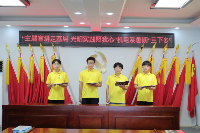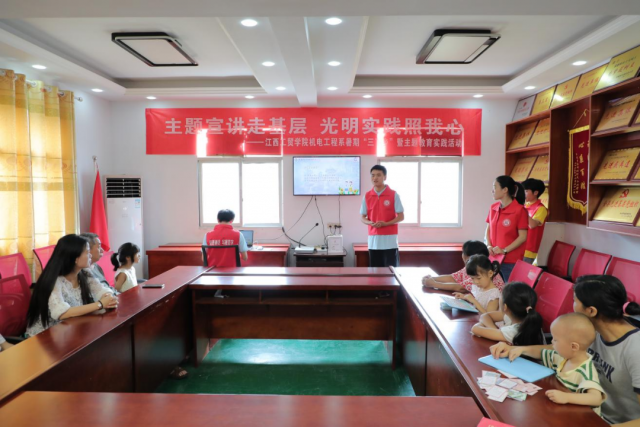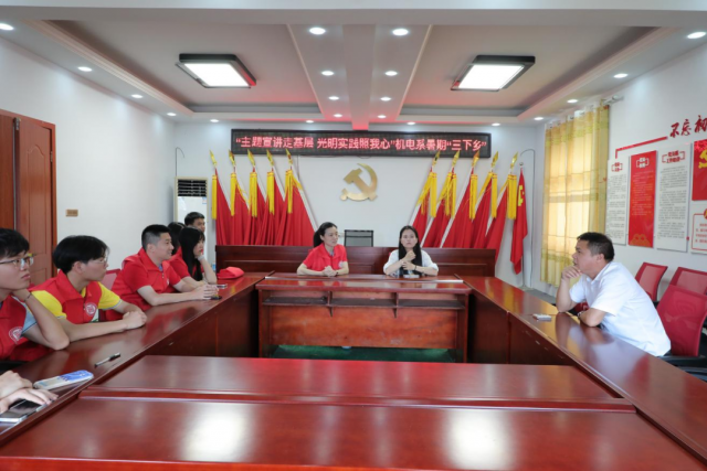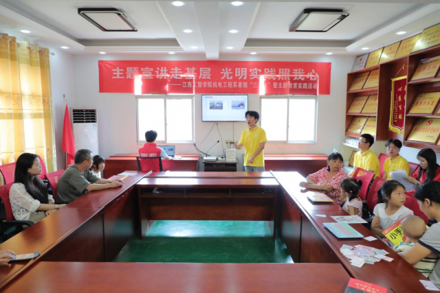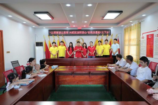 为深入学习贯彻习近平新时代中国特色社会主义思想主题教育,在强化理论学习中推动主题教育走深走实,根据“学思想、强党性、重实践、建新功”的总要求,7月7日,机电工程系光明实践团前往诰峰村开展暑期“三下乡”实践活动。 理论普及宣讲传承红色基因 上午,实践团以主题教育宣讲为主线,依托诰峰村党群服务中心开展红色微党课、红歌诗朗诵、生态宣讲、争做新“普”人等四个专项实践活动。