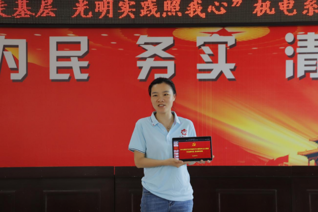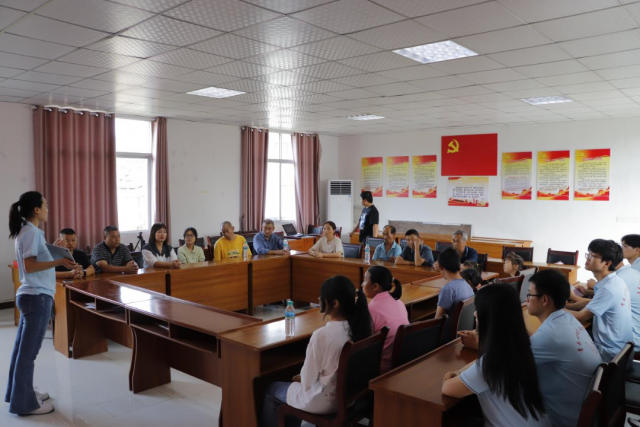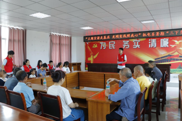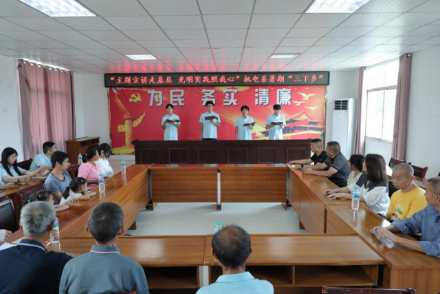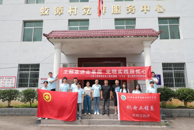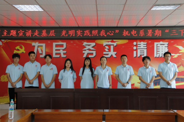 为深入学习贯彻习近平新时代中国特色社会主义思想主题教育,全面贯彻落实党的二十大精神,在社会实践活动中践行文明实践志愿服务精神,7月6日,机电工程系光明实践团在党支部副书记晏慧敏、团总支书记马星宇与辅导员肖欢、徐悦欣的带领下前往蛟潭村新时代文明实践站开展2023年暑期“三下乡”社会实践活动之“万名大学生进千站”文明实践志愿服务行动。 文化服务基层汇聚爱心温暖 7月8日上午,实践团成员通过开展习近平新时代中国特色社会主义思想主题教育微党课、红歌诗朗诵、普通话推广等三个方面在蛟谭村进行主题教育实践服务活动。