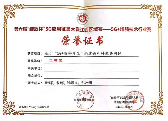 为进一步推动5G应用广泛赋能经济社会各行业转型发展,促进数字经济与实体经济深度融合,加快推动5G规模化应用是我省深入推进数字经济做优做强“一号发展工程”重要赛道,第六届“绽放杯”5G应用征集大赛江西区域赛5G+增强技术行业赛于9月13日在南昌格兰云天国际酒店举行。本次大赛以“5G扬帆风正劲,数实融合新引擎”为主题,是我省推动5G发展以来举办的规格最高、项目最多、规模最大、行业参与度最深的综合性赛事,共分5G+工业物联网、5G+增强技术、5G+智慧教育19个赛道。机电工程系谢晖、韦娜、刘耀元、李洪娟团队第一次参加此类比赛,团队作品从80多个作品中脱颖而出成功晋级,最终以第四名的好成绩取得二等奖。