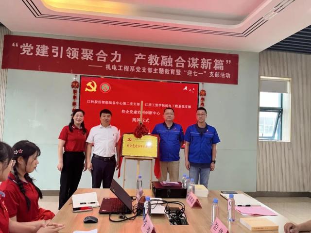 在会上,宋小兵同志用丰富的视频素材,深入浅出展示了我国底蕴深厚的传统文化,阐述了作为一名中国人牢固树立文化自信的坚定和自豪,并结合习近平总书记对以学增智提升政治能力、思维能力、实践能力的明确要求,激励全体党员学好用好习近平新时代中国特色社会主义思想,把思想为力转化为团结奋斗的精神动力,在工作岗位中干出新业绩、展现新作为。 坚定入党初心重温光辉历程 为庆祝中国共产党成立102周年,回顾党的光辉历程,进一步弘扬党的优良传统,保持和发扬党的先进性和纯洁性,在党旗下,全体党员同志面对党旗庄严宣誓:“我志愿加入中国共产党,拥护党的纲领,遵守党的章程,履行党员义务......”。在铿锵的誓词中,党员干部们的初心受到洗礼,爱国爱党情怀得到升华,全体党员更加坚定理想信念、牢记初心使命。 迎七一不忘初心唱响红歌颂党恩 “我和我的祖国,一刻也不能分割;无论我走到哪里,都流出一首赞歌......”一首脍炙人口的红色经典歌曲《我和我的祖国》,唤醒了大家的红色记忆。一字字、一句句红色歌词,唱出了全体党员同志对党、对祖国的无限忠诚与热爱,也同时激励着每个人以更加坚定的信念、更加饱满的热情、更加优良的作风、更加务实的举措,立足新起点、新征程。 党建聚合力互促共发展 为推进主题教育走深走实,进一步整合党建资源,增强党建活力,丰富党建形式,江西工贸学院机电工程系与江铃股份智能装备中心第二党支部联合成立了“校企党建协同创新中心”支部共建合作协议,建构“资源共享、优势互补、互相促进、共同提高”的党建工作新格局。会上,宋小兵、邬剑波为“校企党建协同创新中心”揭牌。