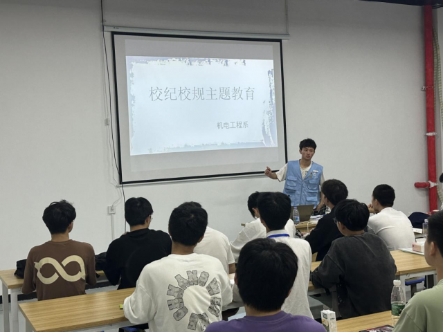 本次安全入学教育讲座,进一步加深了新生对机械操作的危害、防护、应急处置的认识和了解,提高了安全意识,为实训室建立了一道安全防线,帮助和引导新生更好地迎接新学期的学习和科研工作,营造更加安全有序、创新活力的学习环境和工作氛围。 (三)组织校规校纪教育,克己慎独,明善诚身 国有国法、家有家规,为坚定依法治校,规范学生行为,维护学院正常的教育教学秩序和生活秩序,学院有诸多涉及学生管理的制度。
