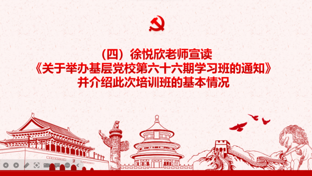 由徐悦欣老师宣读《关于举办基层党校第六十六期学习班的通知》,并介绍此次培训班的基本情况,对党课课堂和笔记做出详细要求,对党员发展流程进行了讲解。希望全体学员能够端正入党动机。在今后的学习生活中更加严格的要求自己,能做到思想上、行动上入党,提高理论修养,增强政治觉悟。 树立奋斗目标践行初心使命