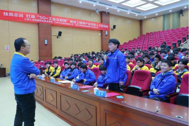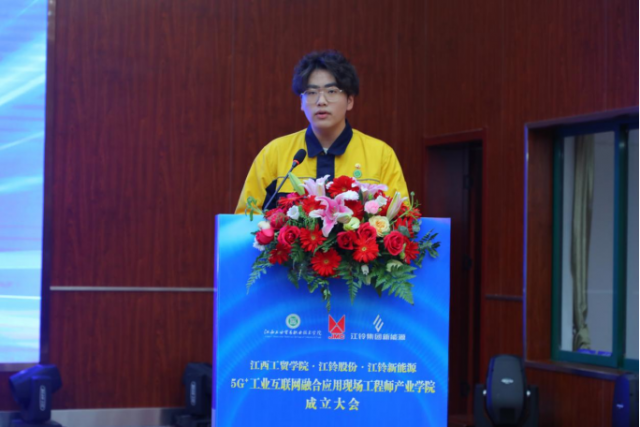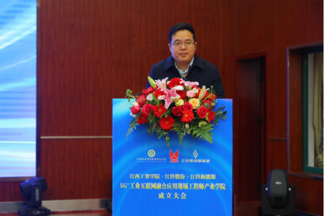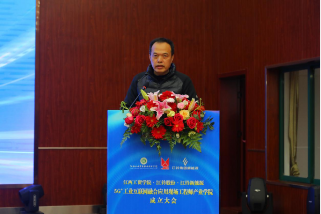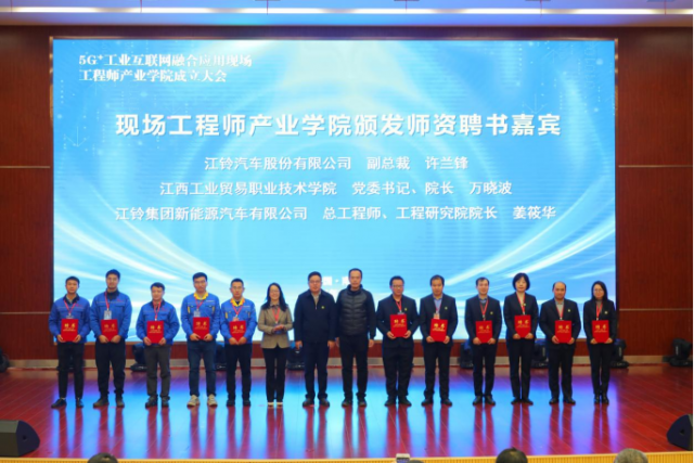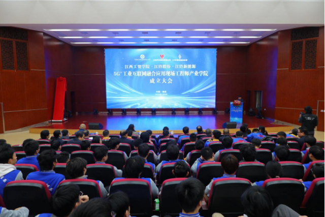1月8日,江西工业贸易职业技术学院(以下简称工贸学院)与江铃汽车股份有限公司(以下简称江铃股份)、江西江铃集团新能源汽车有限公司(以下简称江铃新能源)在学院图文信息中心学术报告厅举行5G+工业互联网融合应用现场工程师产业学院成立大会暨第一期培养班开班仪式。江西工贸学院党委书记、院长万晓波,江铃股份副总许兰锋,江铃新能源总工程师、工程研究院院长姜筱华出席成立大会,学院教务处处长、产学研培发展中心负责人曾聪,机电工程系主任马龙凤,产学研培发展中心副主任黄梅,产业学院校企导师及学生代表等领导和嘉宾共计260余人参加会议。会议由学院党委委员、副院长宋小兵主持。
