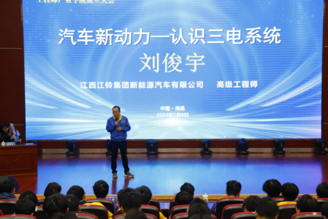 匠心铸就品质 创新驱动高质量发展 随后开展“大师进校园”环节,特别邀请江铃股份智能设备运维主任技师曾祥宗导师、江铃新能源高级工程师刘俊宇导师为第一期培养班200名学生分别开展题为《这个时代需要我们,这是我们的时代》及《汽车新动力---认识三电系统》讲座,零距离聆听技能大师传道授业解惑,同时又将新能源汽车行业中最前沿的技术传递给同学们,增强同学们的专业认同感,开启现场工程师产业学院第一期培养班的第一课。