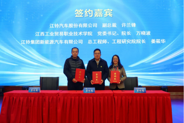 深化产教融合 推动高质量协同育人 万晓波在致辞中代表学院对江铃股份和江铃新能源各位领导、嘉宾的到来表示热烈欢迎,并简要介绍了学院办学历史、规模、特色成效及近年来在持续深化现代职业教育体系建设改革进行的探索。他指出在推进产教融合、校企合作的过程中,两家企业均给予了学院大力支持,取得一系列阶段性成果,此次产业学院合作是三方深入贯彻落实现代职业教育体系建设的又一重要举措,通过强强联合、优势互补,共同开展现场工程师人才培养,不断培养高素质技术技能人才、大国工匠、能工巧匠,为构建体现江西特色和优势的现代化产业体系贡献力量。