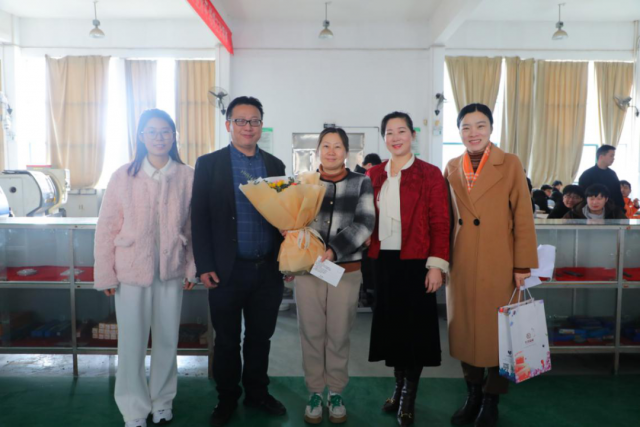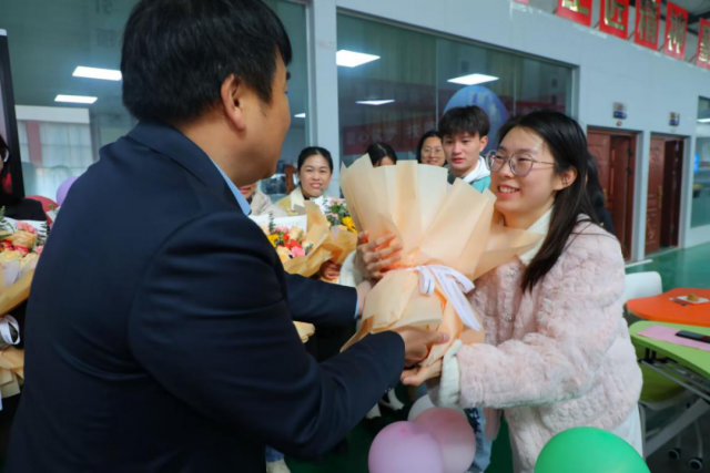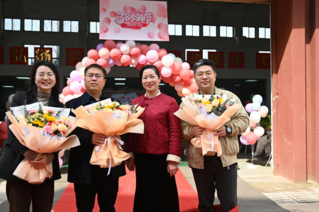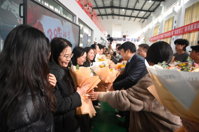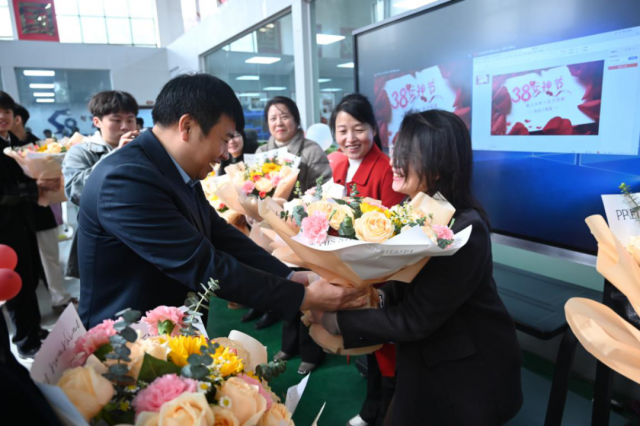 随后,学院党委委员、副院长宋小兵向机电校友、全体女教职工致以最美好的节日祝福和最崇高的敬意,他表示女教师们一直以来都是学院的中坚力量,为学院的发展做出了巨大贡献,同时也感谢校友们一直以来关心关注母校的发展,愿大家携手并进,为工贸学院双高院校建设增光添彩。 宋院长与几位校友们一起给每位女教职工送上精美的花束,向她们表示诚挚的祝福。