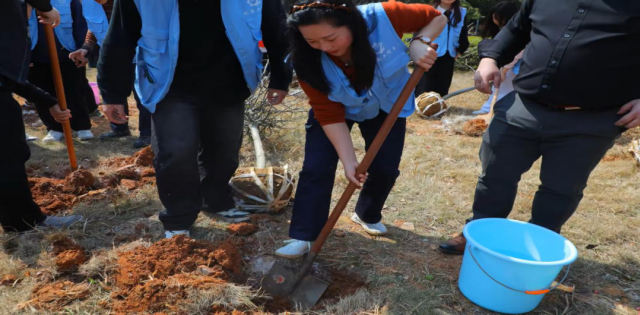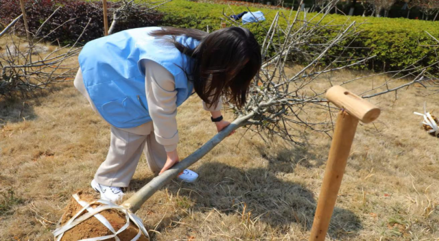 海棠添新色 此绿“植”属你 紧接着,志愿者们积极行动,手持工具,全身心投入到植树活动中。大家分工协作、相互配合,有条不紊地挖坑、铲土、栽树、浇水,忙得不亦乐乎,现场一派热火朝天的景象。在大家的共同努力下,一颗颗树苗在春光的照耀下昂首挺胸,为明媚的春日增添色彩。