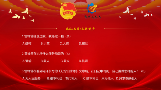经过此次“学雷锋知识竞答”活动向学生普及雷锋小知识,并通过有奖竞答的方式激发同学参与答题的热情,助推雷锋精神在心中落地生根,枝繁叶茂。