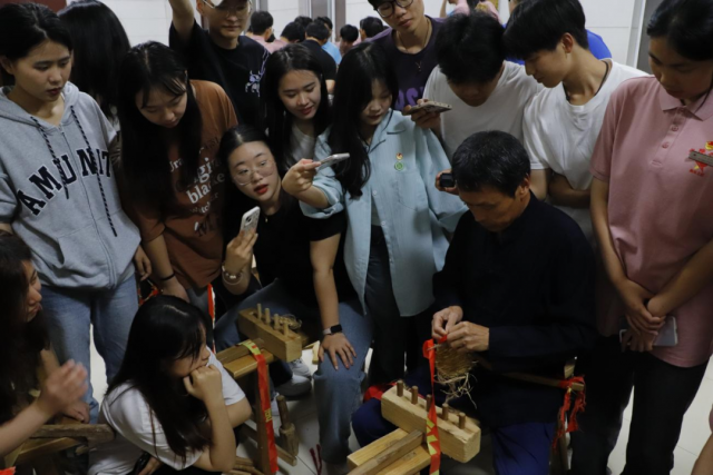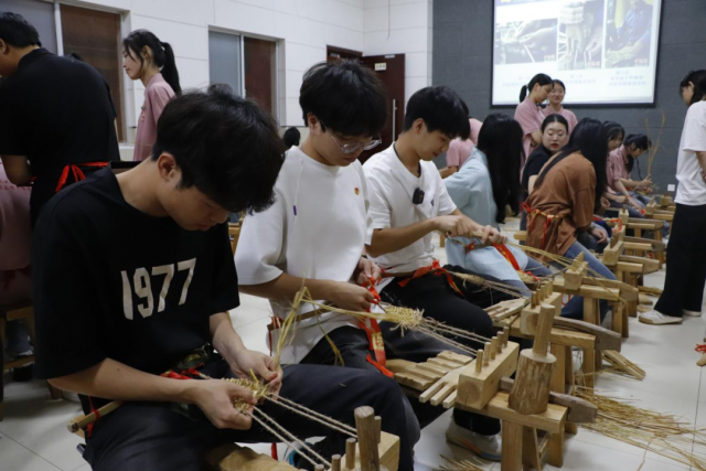 编红军草鞋悟红军精神 24日晚,同学们借助传统的编制工具和材料,进行了“编红军草鞋”体验教学。一系二搓三编压,一根根稻草,在麻绳来回穿梭间,在草鞋师傅的巧手下,被编织成了一双双草鞋。学员们纷纷学着草鞋师傅的模样,通过搓、挽、编、压、敲亲身体验编织草鞋,感悟着当年革命先辈的不易,体会着革命之路的艰辛,立志发扬艰苦奋斗的优良作风,争做新时代好青年。